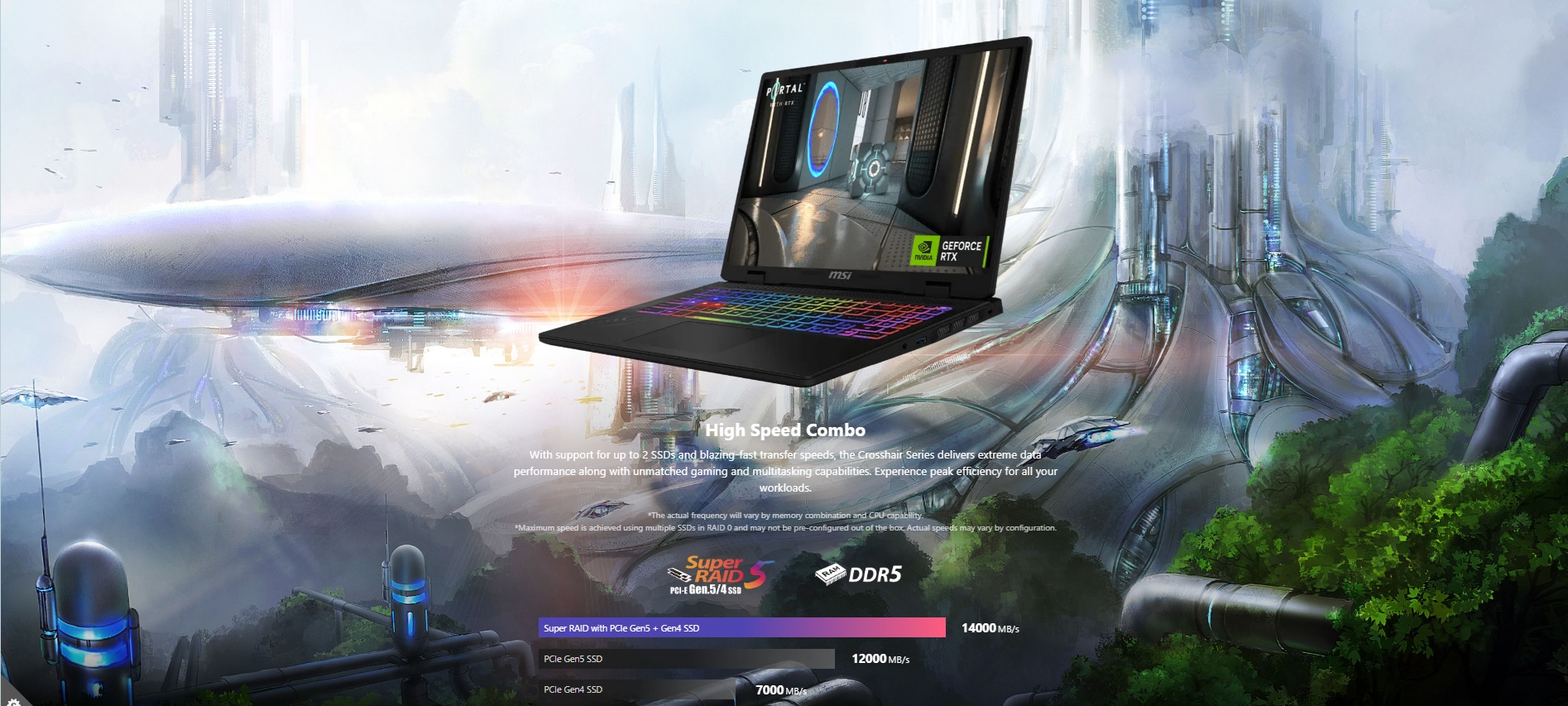 | STORAGE CAPABILITY | 1x M.2 SSD slot (NVMe PCIe Gen4), 1x M.2 SSD slot (NVMe PCIe Gen5) Compatible ”Please consult service center for upgrading SSD.” |