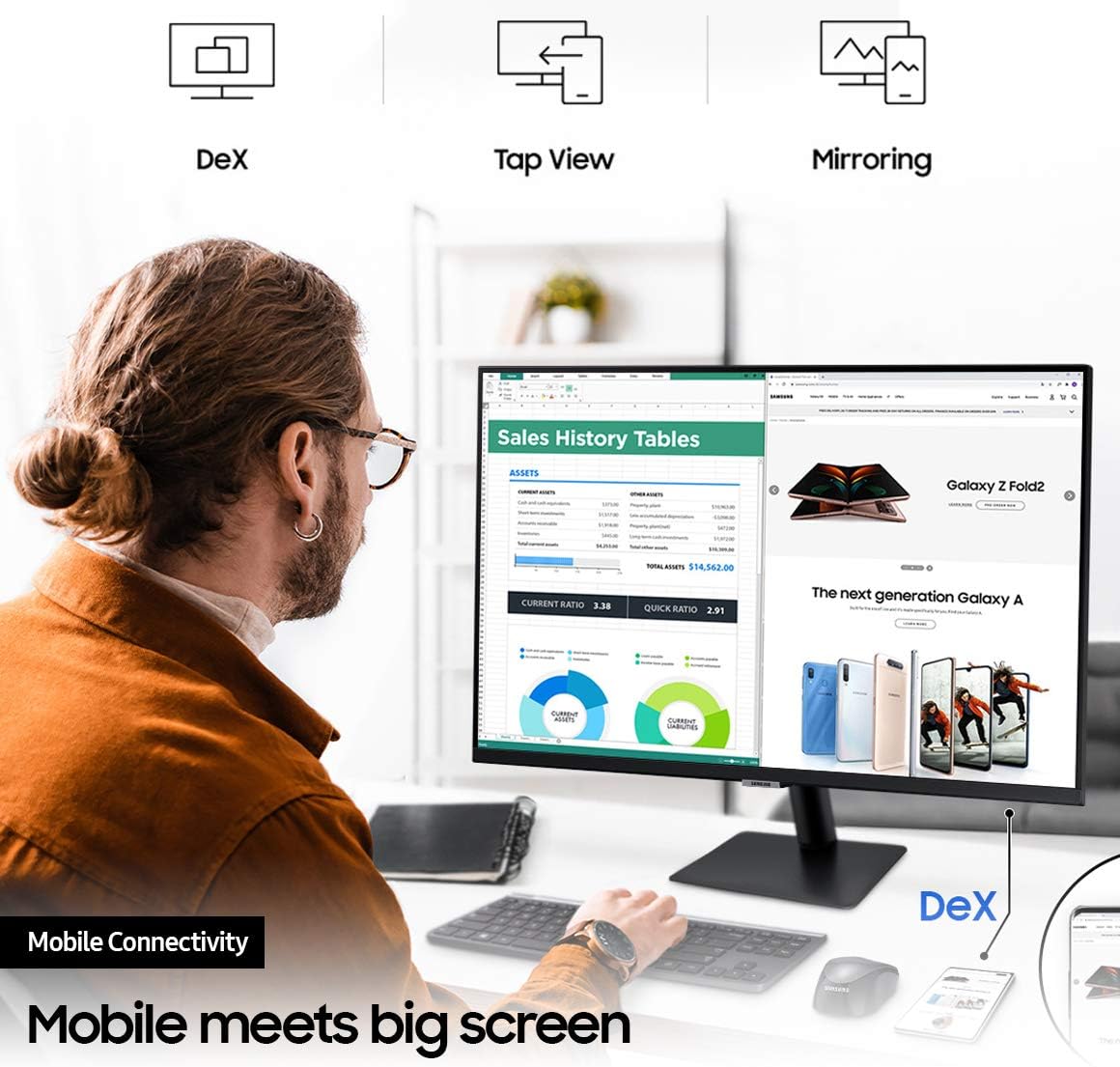 - MOBILE CONNECTIVITY: Wireless DeX unlocks a full PC experience. Use mobile productivity apps, such as video conferencing, documents, and browsers, through just your monitor and phone